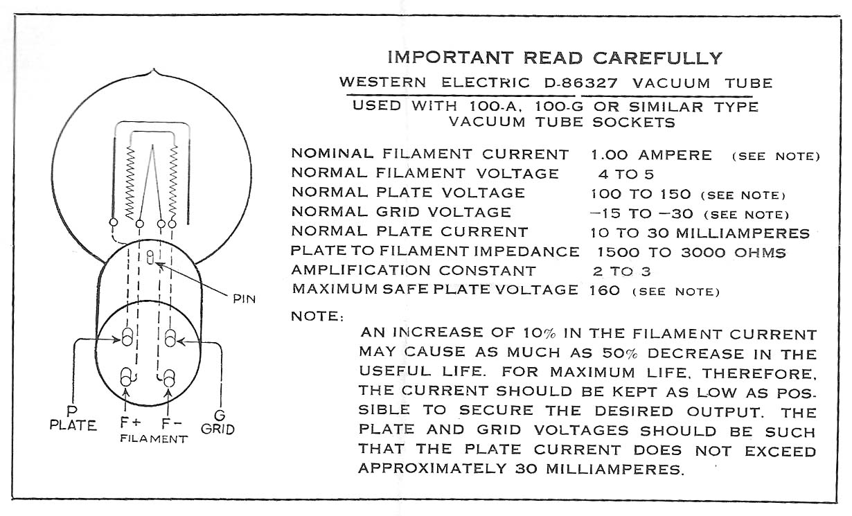 The D86327 is a triode with a mu of 2 to 3. The D86327 was a high insulation version of the WE104A. Length = 4.50" Diameter = 2.37" Max voltage = 160 Max current = .30 Fil voltage = 4.5 Fil current = 1 amp GOTO INDEX