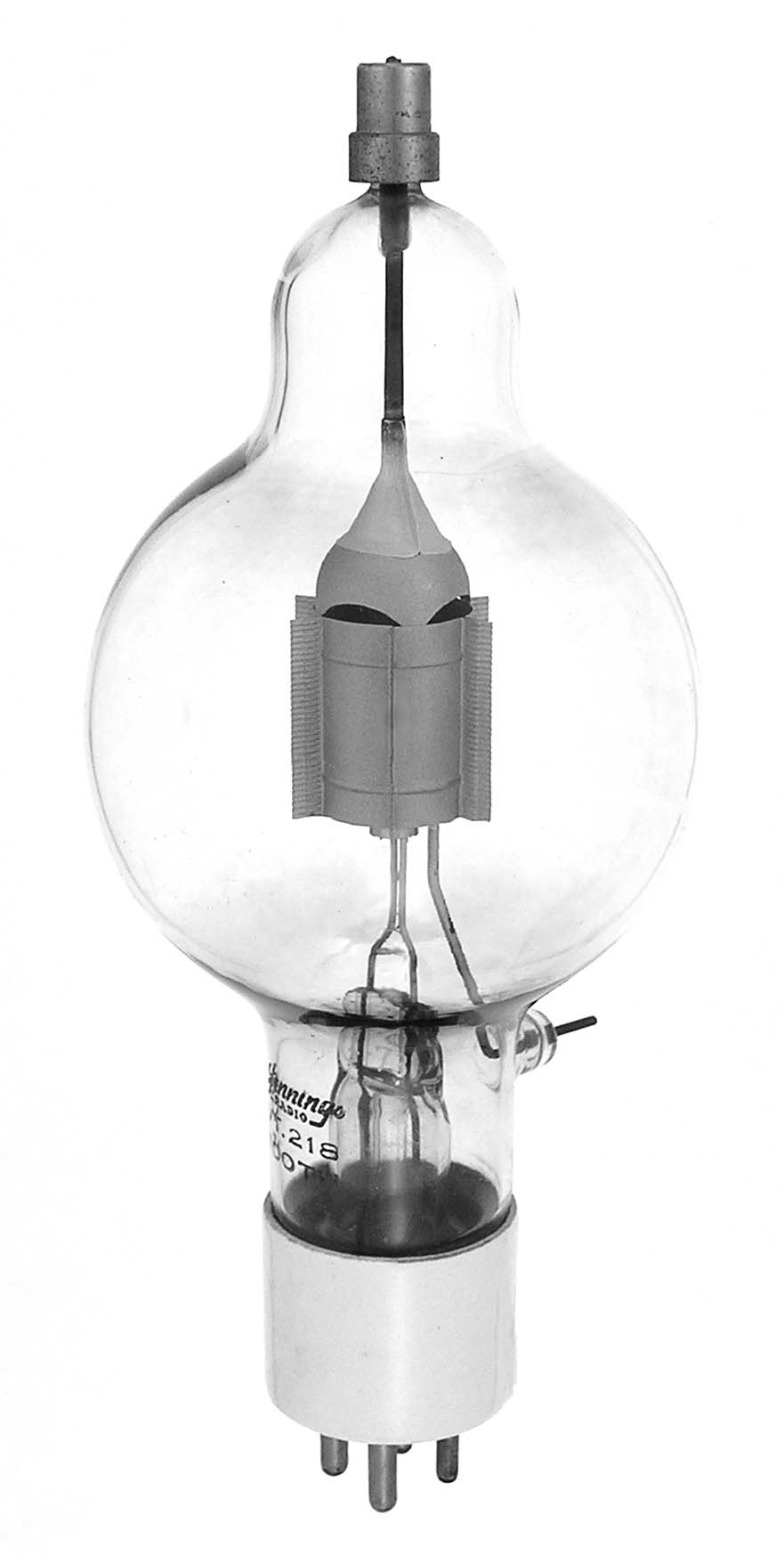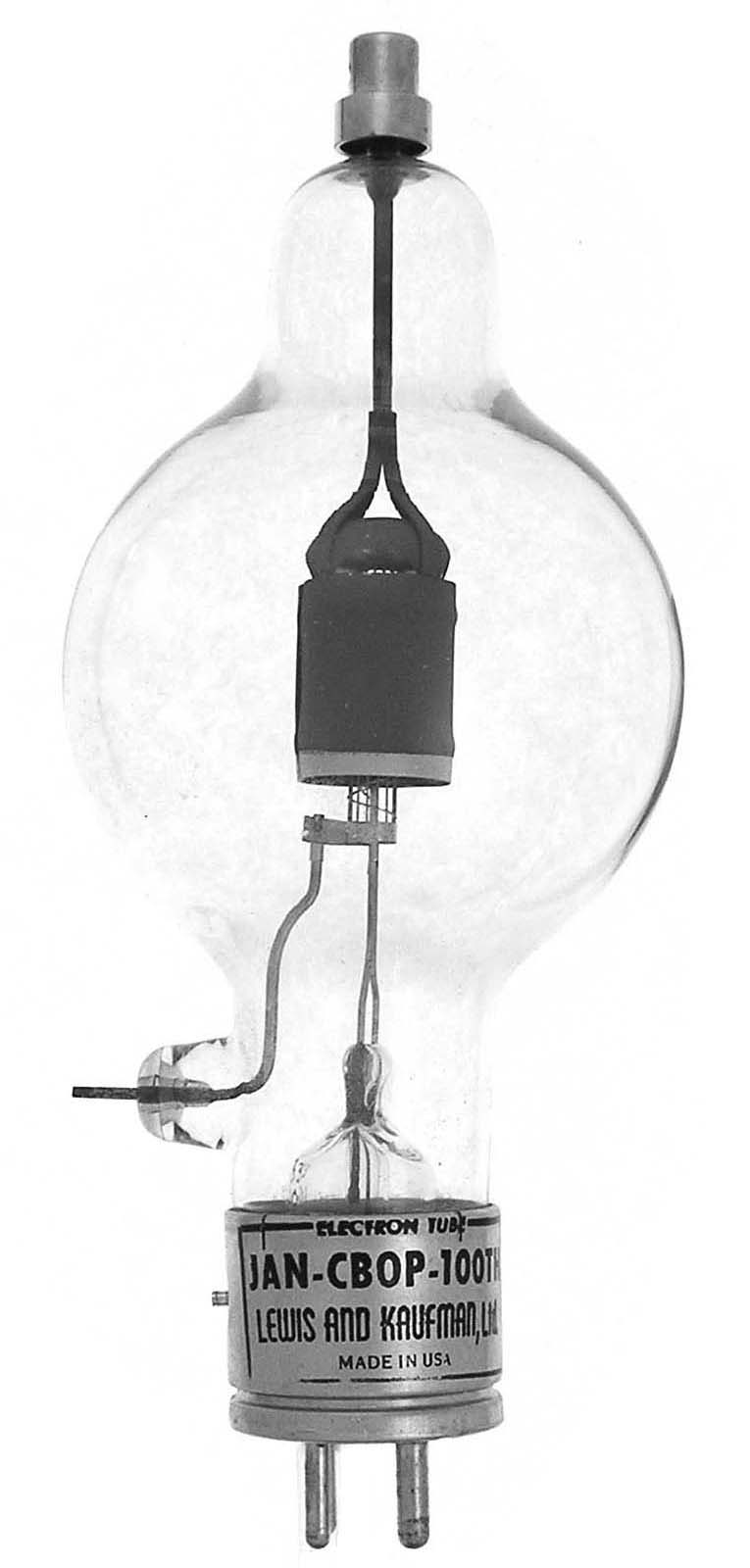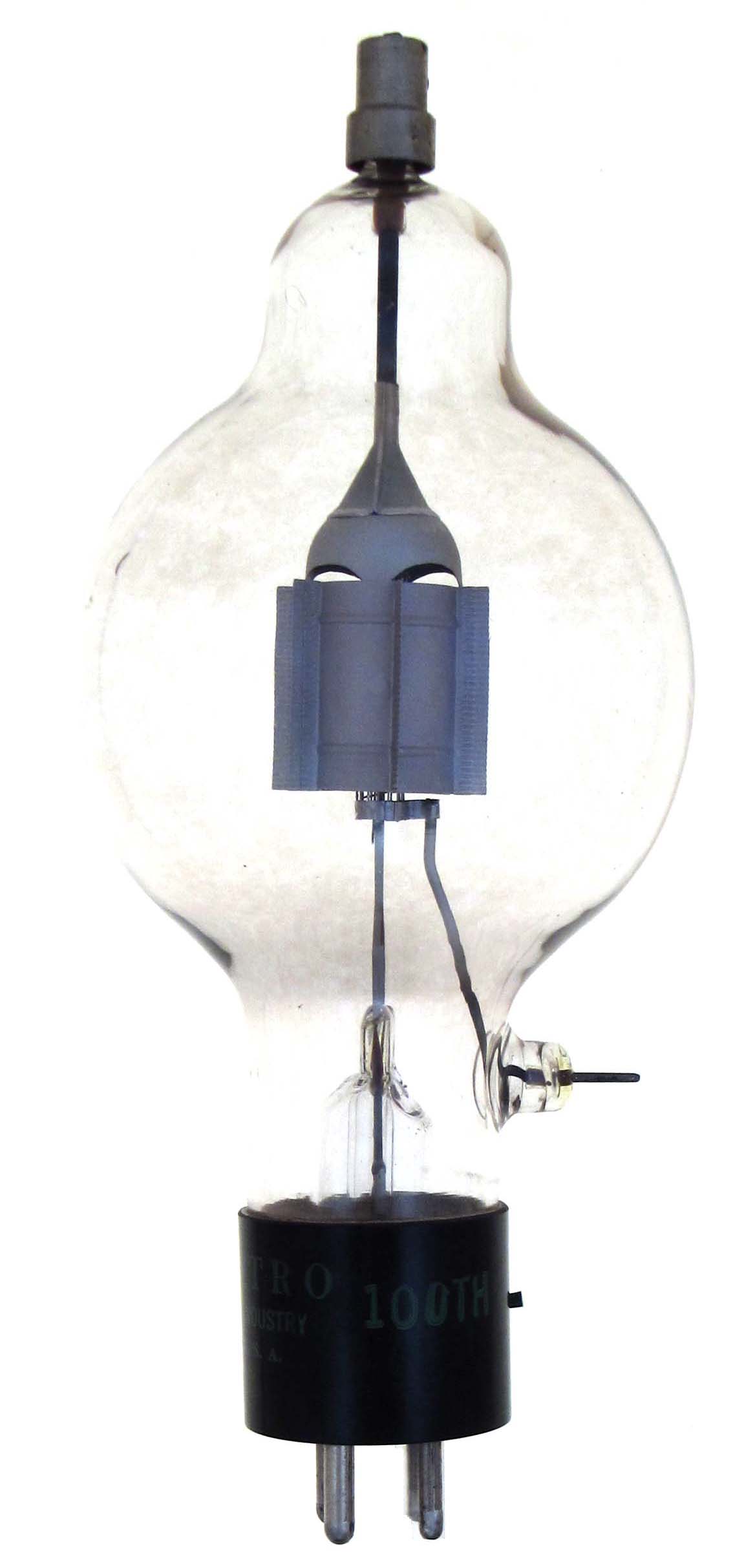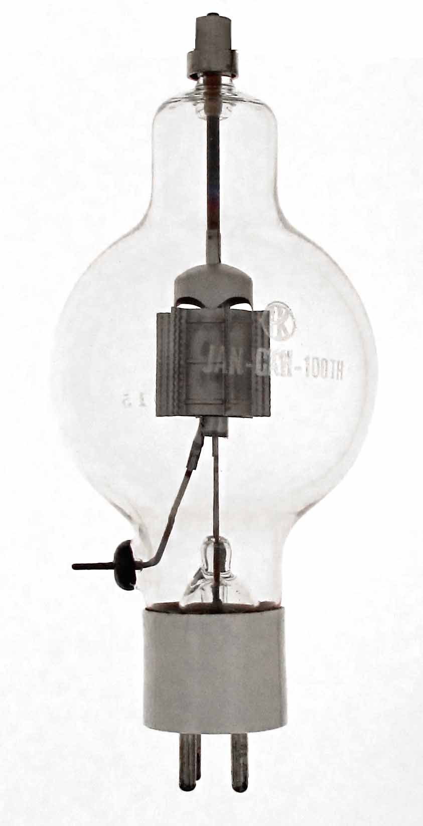 The 100TH or VT-218 is the new designations for the 100T "HI" version made by Eimac. It is rated at 100 watts with full power to 40 MHz and had a mu of 38. The 100TL was the same tube with a mu of 14. The first example is an early example of the Eimac tube with the bent grid support wire and the second shows the shorter wire version. Post war tubes had their construction materials changed. The fifth example was made by General Electronics, the sixth by GE, the seventh by Jennings, the eighth by ICE, the ninth by Lewis and Kaufman, the tenth by EEI, the eleventh with the black base by Industro, the twelfth by H&K and the thirteenth by Sylvania. The foutreenth example is marked as an Arctarus tube but is obviously an Eimac tube that has been re-branded. The glass work around the grid seal is very poor and could have been a reject. The Japanese designation for this tube is the 4T17.