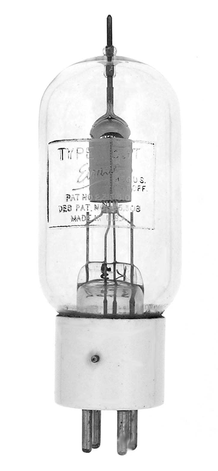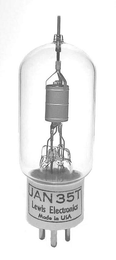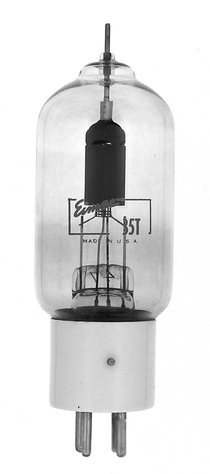 The 35T is a 50 watt dissipation triode with a mu of 39 and a maximum frequency of 100 MHz for full ratings. The 35T was introduced in advertisments in April 1936. The first 35Ts had no caps over the plates but they were soon added as shown in the second example. Post war tubes changed to "Pyrovac" plate material and were made with the white ceramic as well as aluminum bases as shown in the third and fourth examples and some with black ceramic bases. Some 35T tubes were produced by Lewis Electronics. The 35T is a smaller version of the 50T and an experimental tube having characteristics of both and is shown on the 50T page.