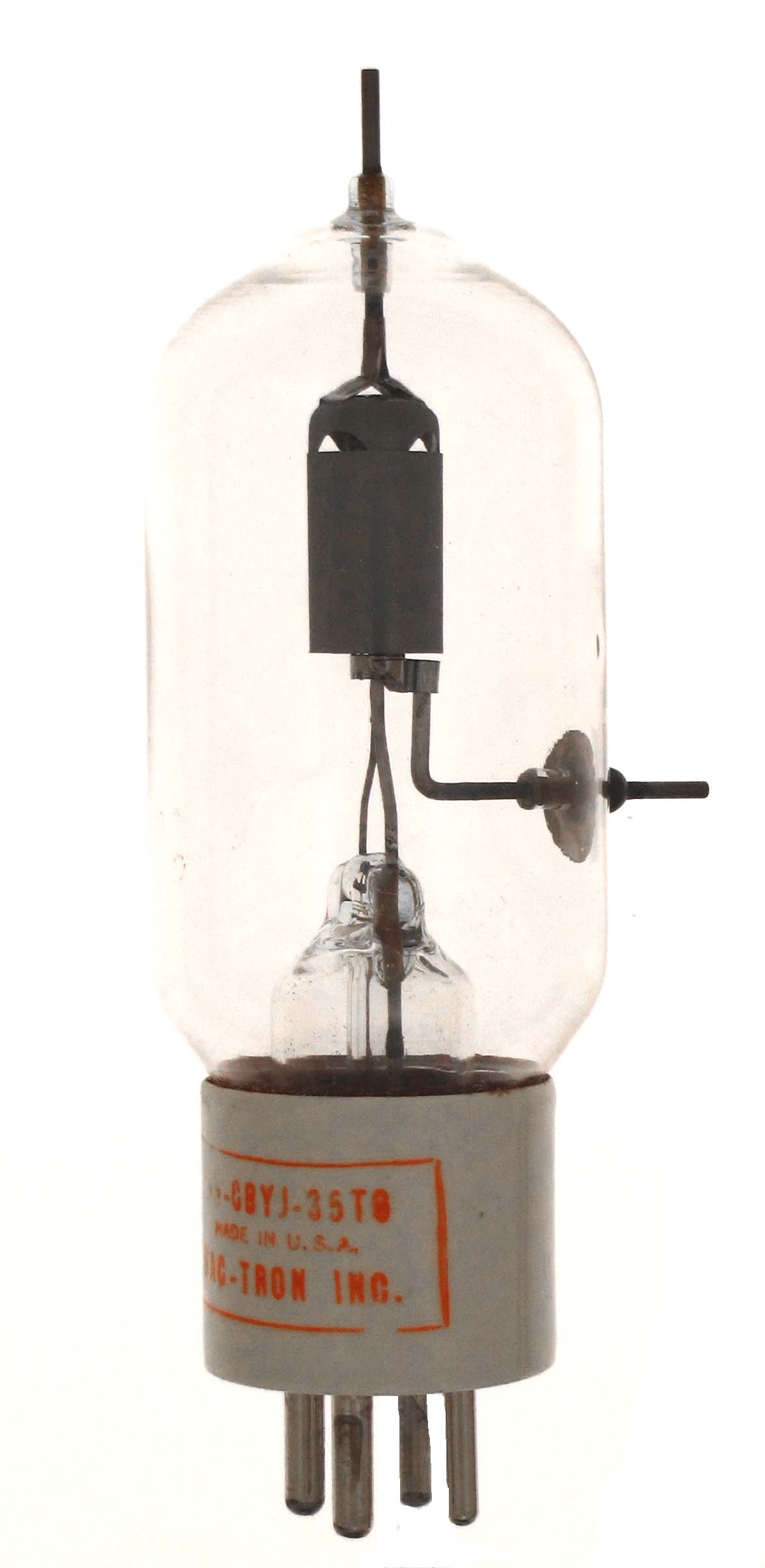 The 35TG is a 50 watt dissipation triode that has the same characteristics as the 35T except for the side grid pin on the 35TG and slight differences in capacities. Both have a mu of 39 and a maximum of 100 MHz for full ratings. The first example is the earliest version of the tube and the second is post war. The third example has been branded VAC-TRON but appears to be a late model Eimac.