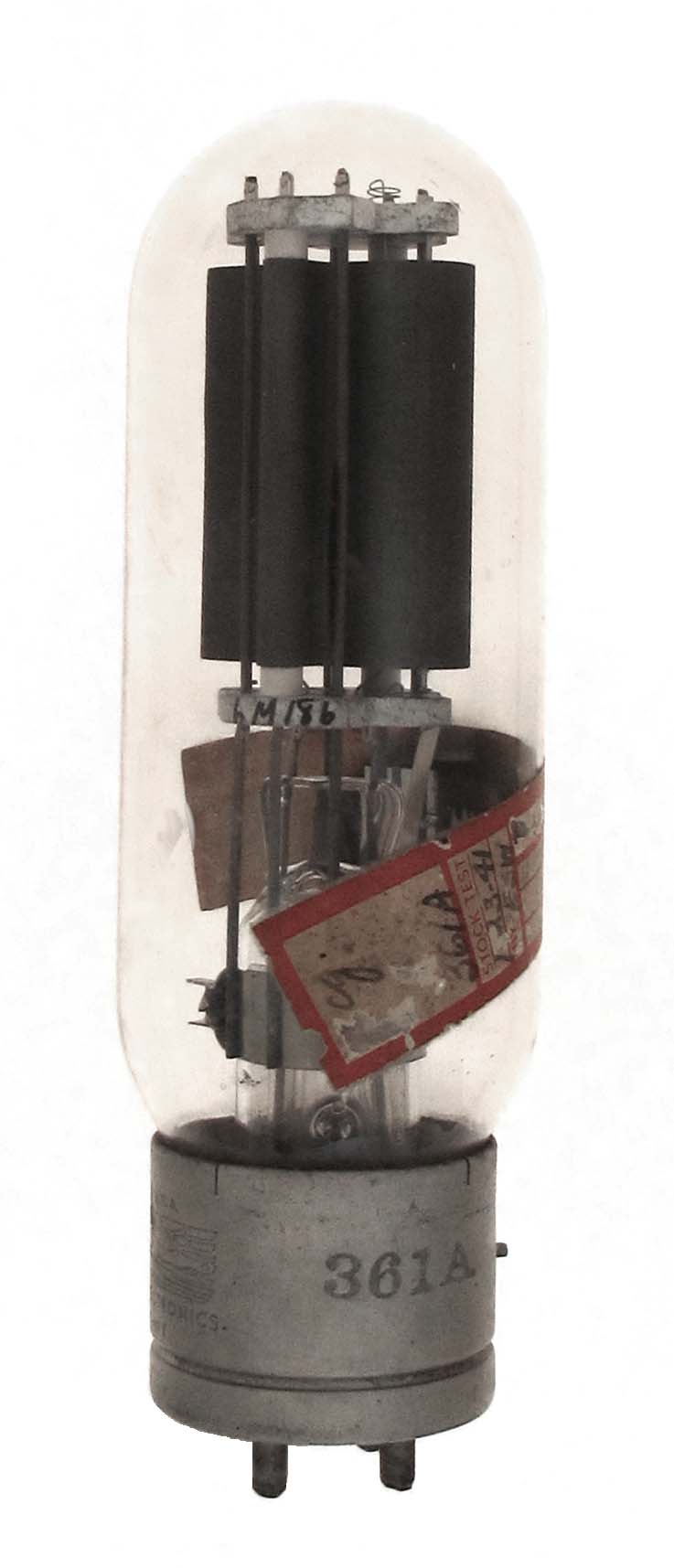 The 361A is a 100 watt triode with a mu of 12 made by United. About 1944, United renumbered it as the 261A that was the designation of the Western Electric original. This example was tested in 1941 and is marked 311CT on the lower insulation.