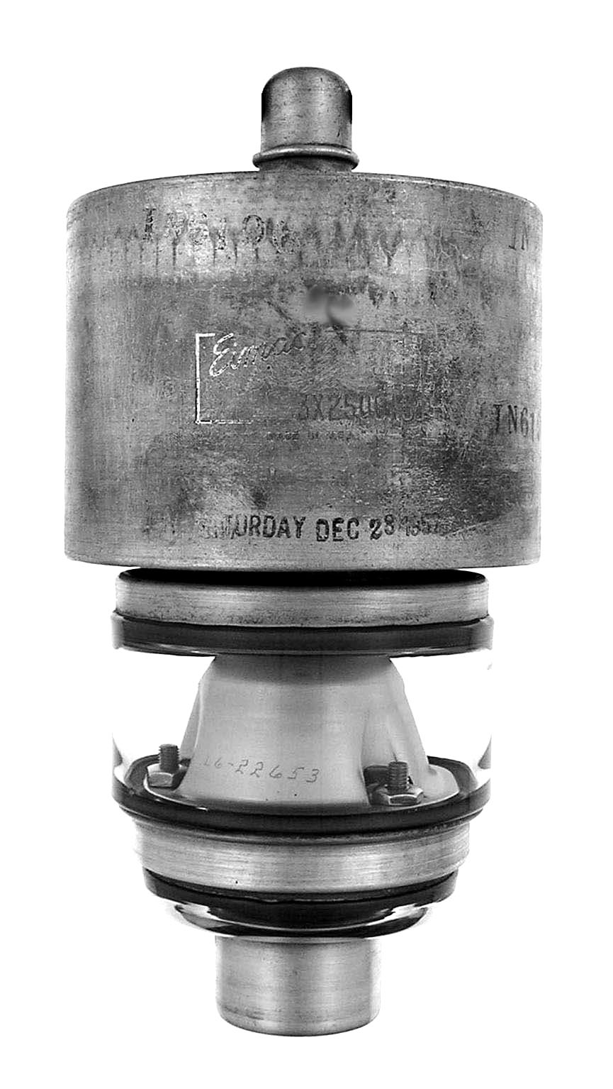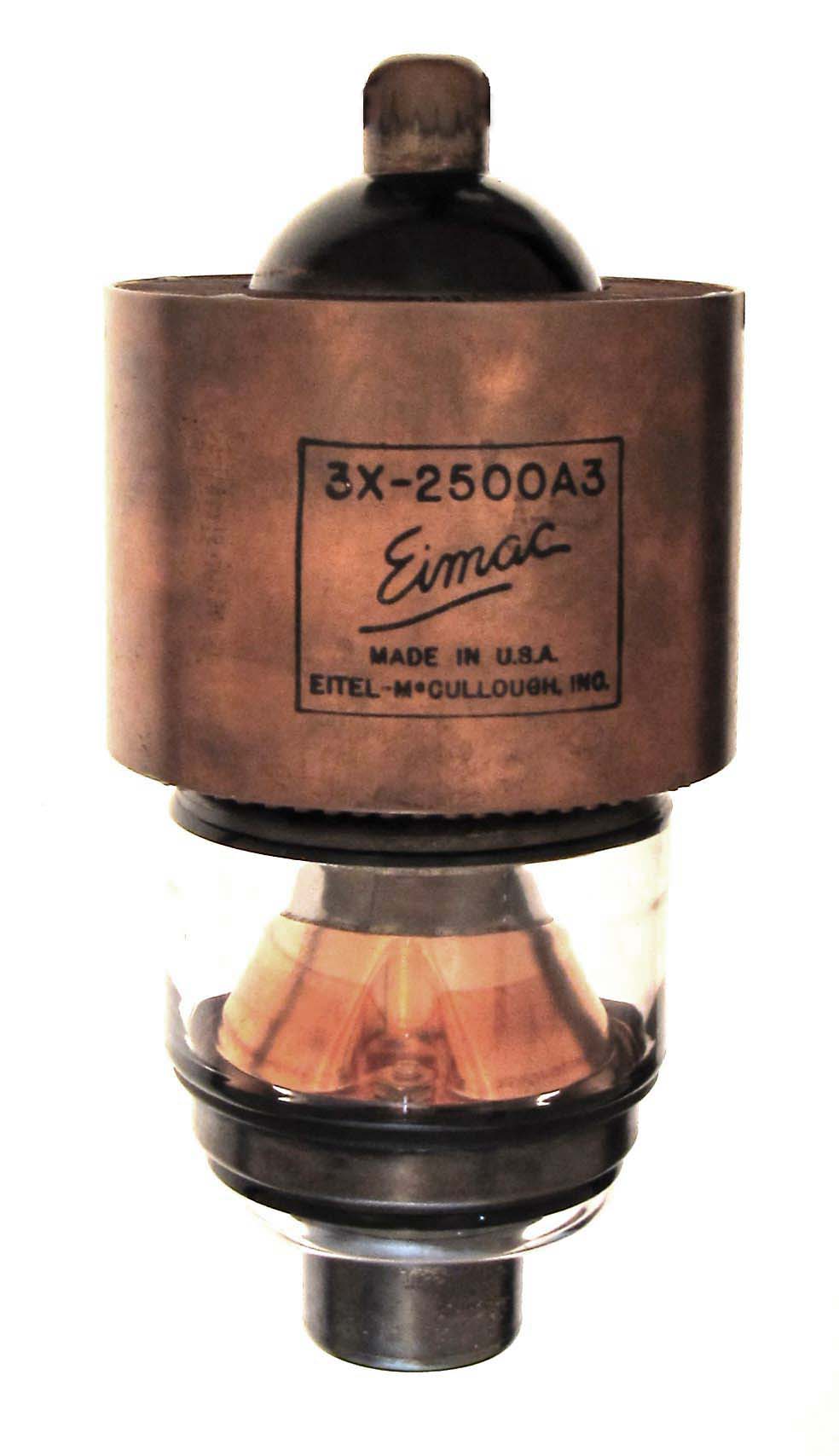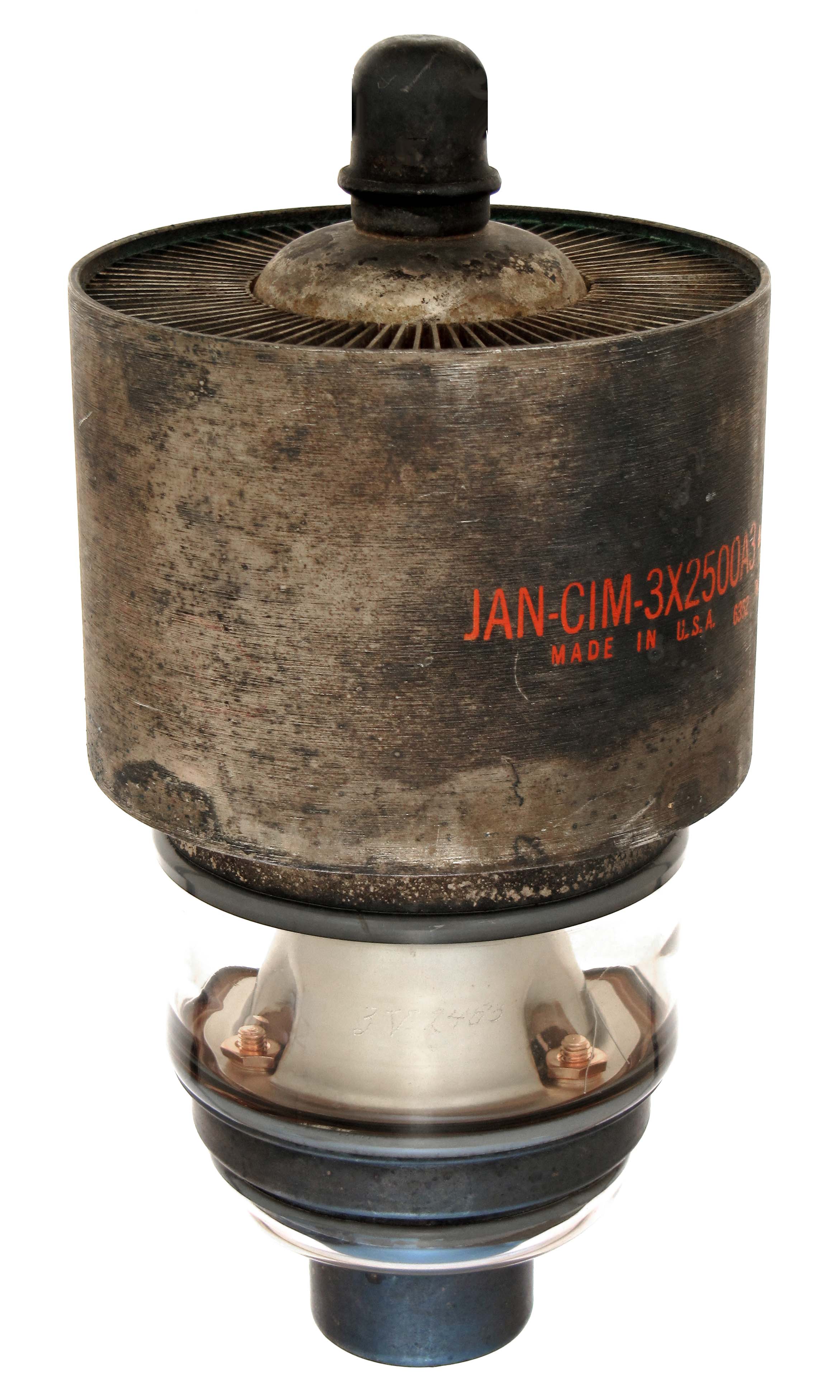 The 3X2500A3 or 8161 is a 2500 watt triode with a mu of 20 and a maximum frequency for full output of 75 MHz. Forced air is required. The tube was first offered for sale in late 1945 and I beleive the first example is one of these early tubes. The anode isn't plated and is soldered to the cooling fins. The black painted dome of the anode is also larger than later tubes. The second example is a newer version and has the more efficient anode construction. As shown in the third example, some tubes of this type were equipped with a special industrial filament connection.
