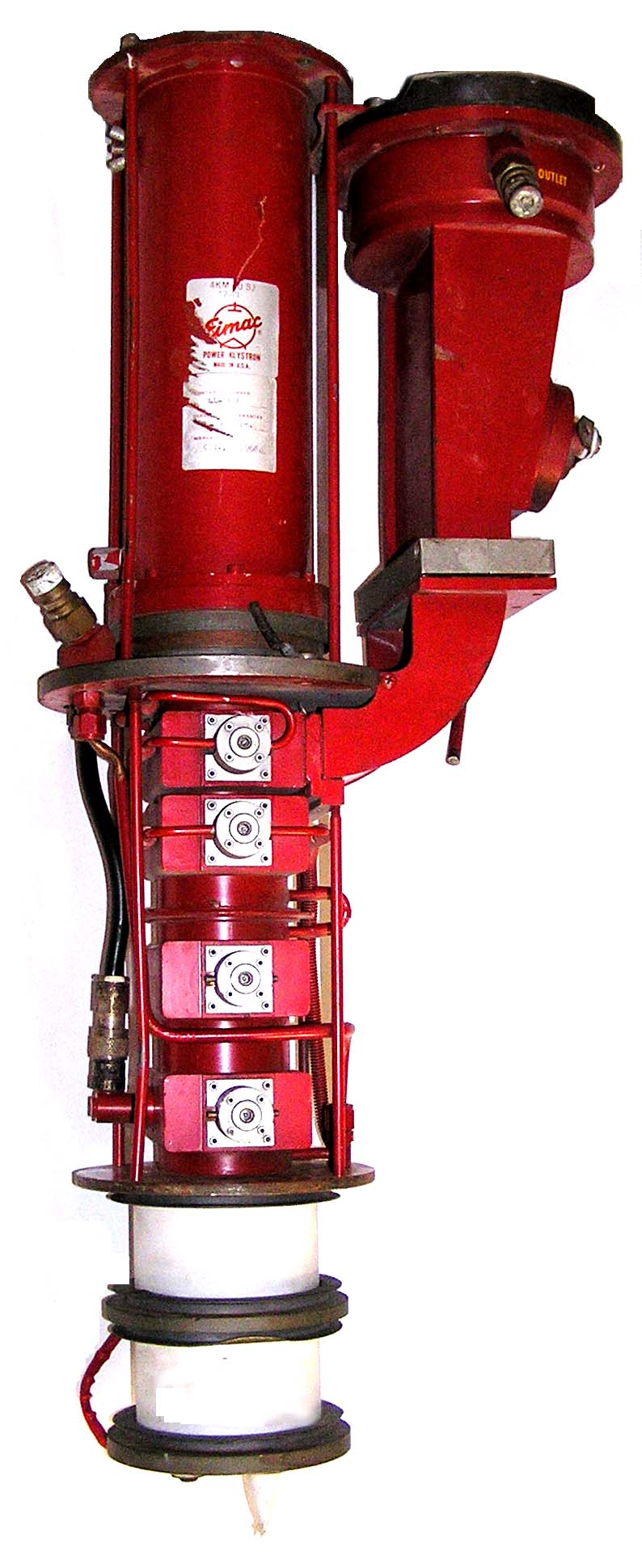 The 4KM50SJ is a 10 KW klystron. It operates from 1.7 to 2.4 GHz. This was Eimac's first high power microwave product. It features an internal titanium vacuum pump.