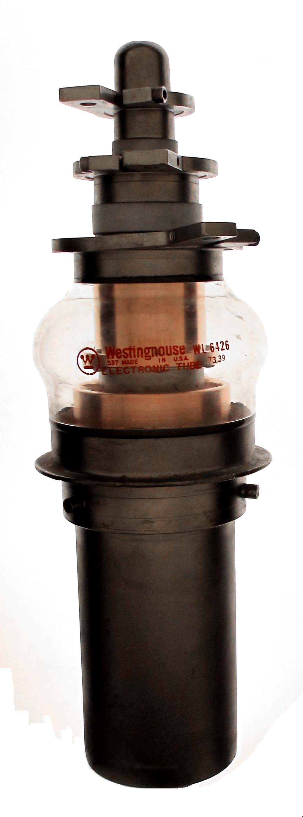 The 6426 is a 40 KW, water cooled power triode with a mu of 20. This example was made by Westinghouse (WL6426). The 6427 is the same tube with forced air cooling fins.