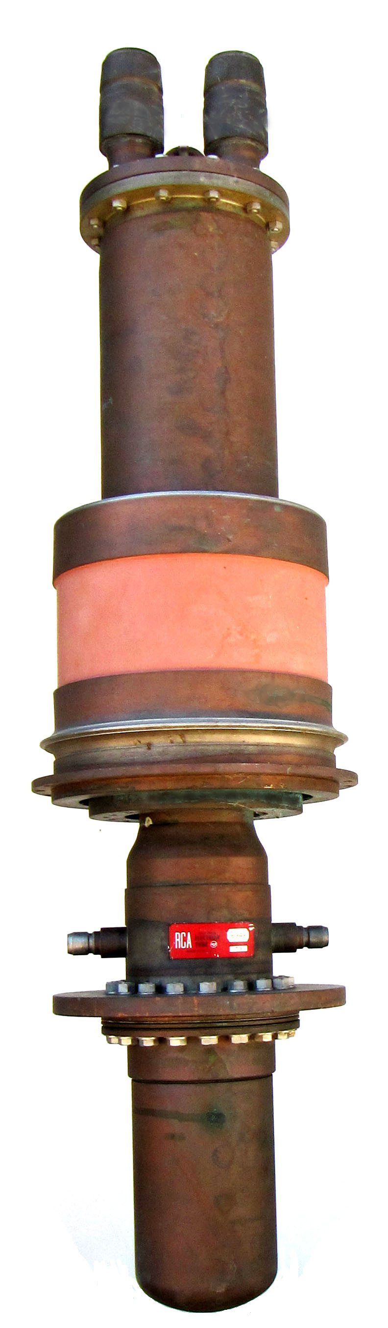 The 6949 is a 400,000 watt dissipation power beam triode with a mu of 60 made by RCA. It has a full power rating up to 75 mHz. Designed for an output of 500,000 watts. The anode, grid and filament are water cooled. The anode requires 88 gallons per minute at maximum dissipation. Used in high power military transmitters including the AN/FRT-32, AN/FRT-33 and the RCA BTH-250A AM broadcast transmitter.
