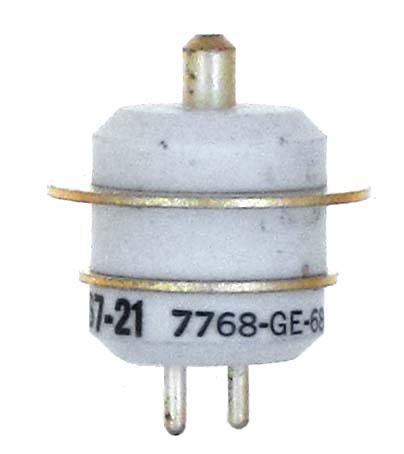 The 7768 is a 5.5 watt dissipation planar triode with a mu of 225. Made by GE. Length = .93" Diameter = .75" Max voltage = 330 Max current = 30 ma Fil voltage = 6.3 Fil current = 400 ma GOTO INDEX