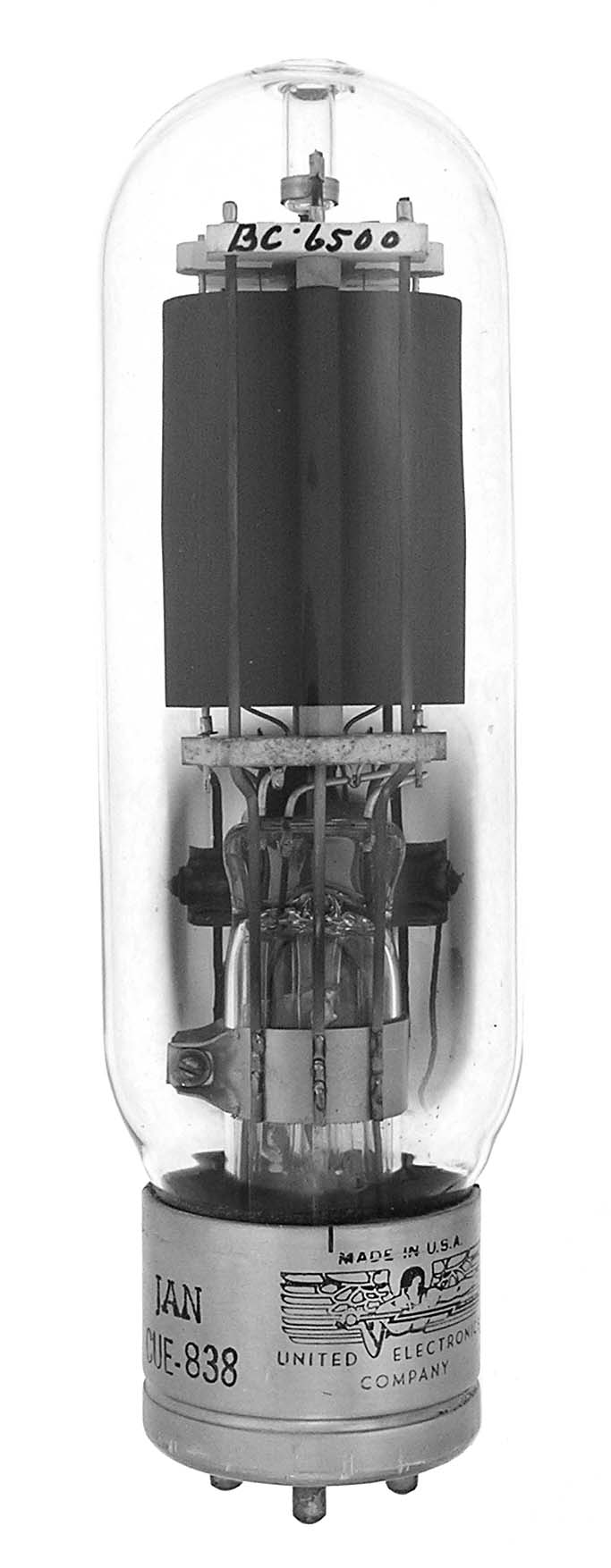 The 838 or 38138 is a general purpose, 100 watt, triode with a variable mu and with full power to 30 MHz. United produced the 838 with an additional plate support for ruggedization and some of these tubes were marked 838W. Internally this United tube was marked with United's commercial number 938.