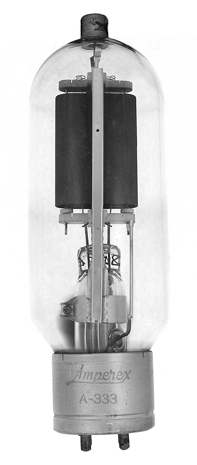 The A-333 is a 125 watt triode with a mu of 12.5 used for RF heating applications up to 30 MHz. Made by Amperex. Length = 8.13" Diameter = 2.50" Max voltage = 1500 Max current = .210 ma Fil voltage = 10 Fil current = 3.25 amps GOTO INDEX