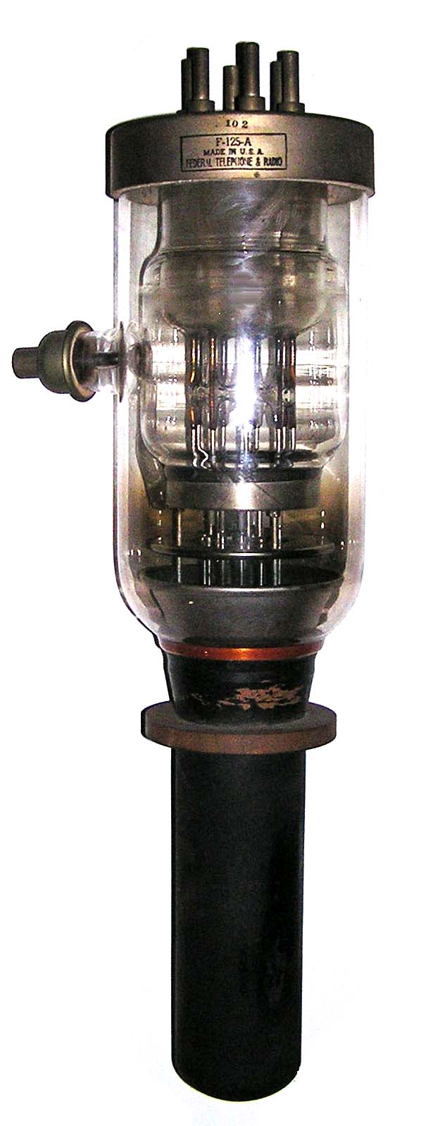 The F-125A is a power triode with a mu of 4.8 made by Federal Telephone & Radio and is rated at 40 KW. It requires 15 gallons per minute of water cooling and was designed for audio applications.