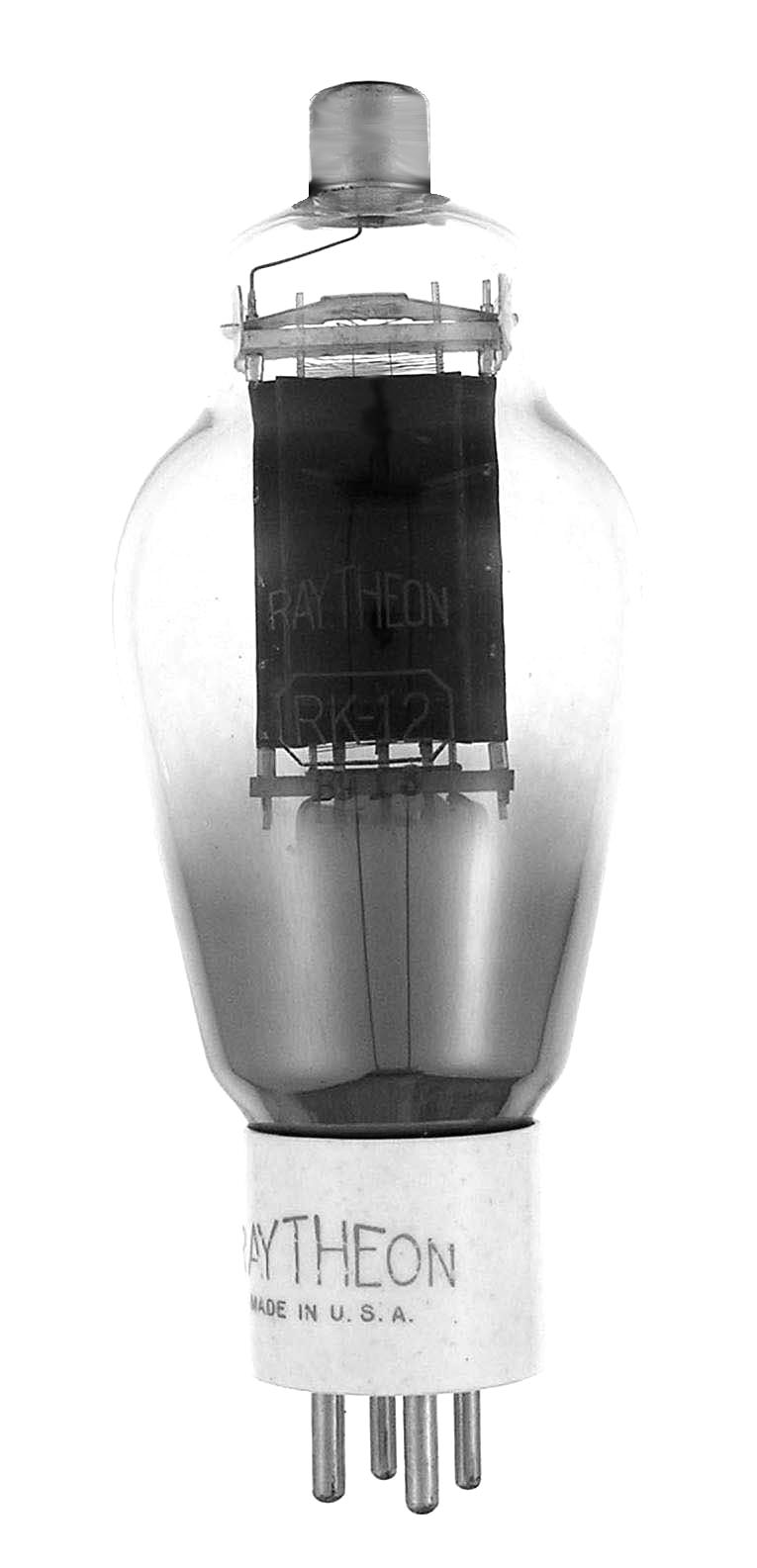 The RK-12 is a 25 watt dissipation triode with a mu of 80 and full ratings to 60 MHz made by Raytheon. A low mu version of this tube is the RK-11.