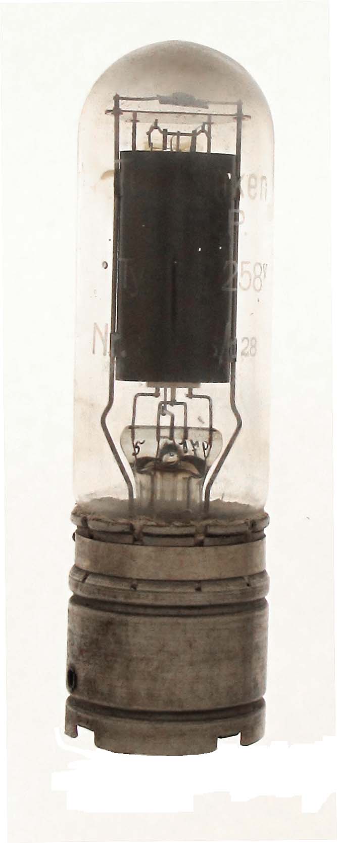 The RV258 is a 32 watt triode with a mu of 7 made by Telefunken. The second example is marked D.R.P. for Deutsches Reichspatent.