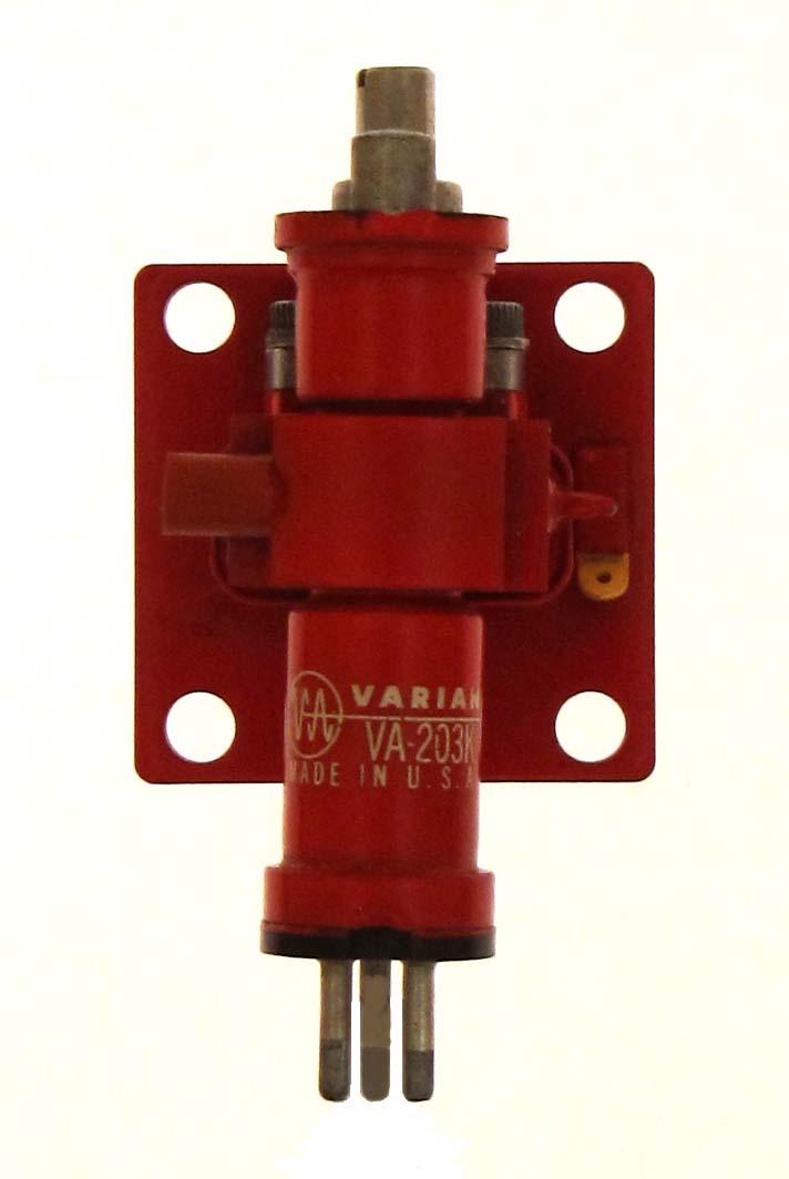 The VA-203k is a 30 mW reflex klystron operating over a range of 10.135 to 10.365 gHz. Made by Varian. Length = 3.12" Width = 1.63" Max resonator voltage = 300 Resonator current = Fil voltage = Fil current = GOTO INDEX