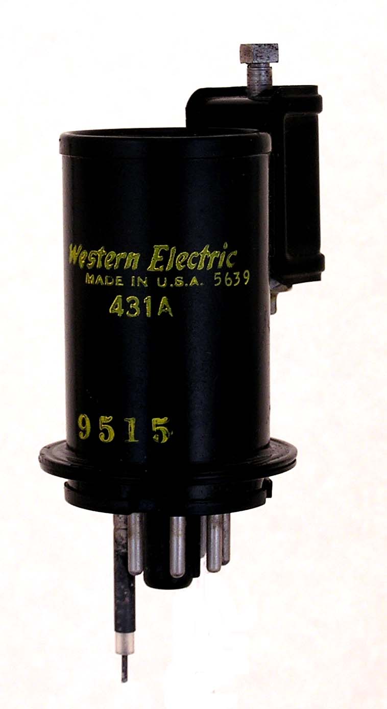 The WE431A is a reflex klystron which operates from 3.7 to 4.2 GHz. Output is into a small coaxial connector. Length = 4.20" Diameter = 1.60" Max voltage = 475 Resonator Max current = 40 ma Fil voltage = 6.3 Fil current = .44 amp GOTO INDEX