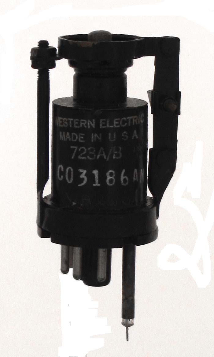 The WE723A/B is a klystron capable of 20 mW from 8700 to 9550 MHz. Length = 3.50" Diameter = 1.50" Max voltage = 300 beam Max current = 32 ma Fil voltage = 6.3 Fil current = .44 amps GOTO INDEX